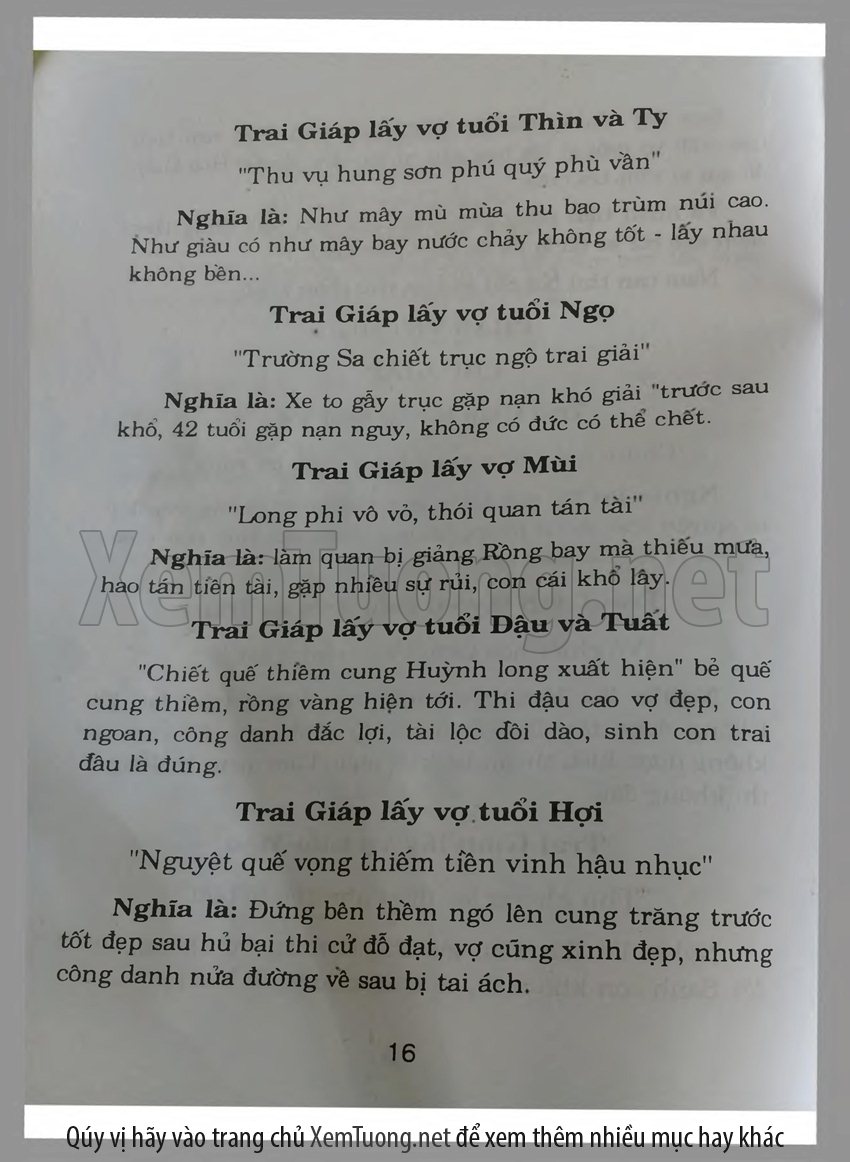 Sách số Coi tuổi làm nhà và Dựng vợ gả chồng giải thích một cách kỹ lưỡng về tuổi kết hôn đẹp và những người hợp tuổi nhau, minh chứng cho điều đó là cuốn sách hướng dẫn xem tuổi cưới vợ do tác giả Huỳnh Liên đã viết rất cặn kẽ về ngũ hành tương sinh, ngũ hành tương khắc và tuổi tứ hành xung.