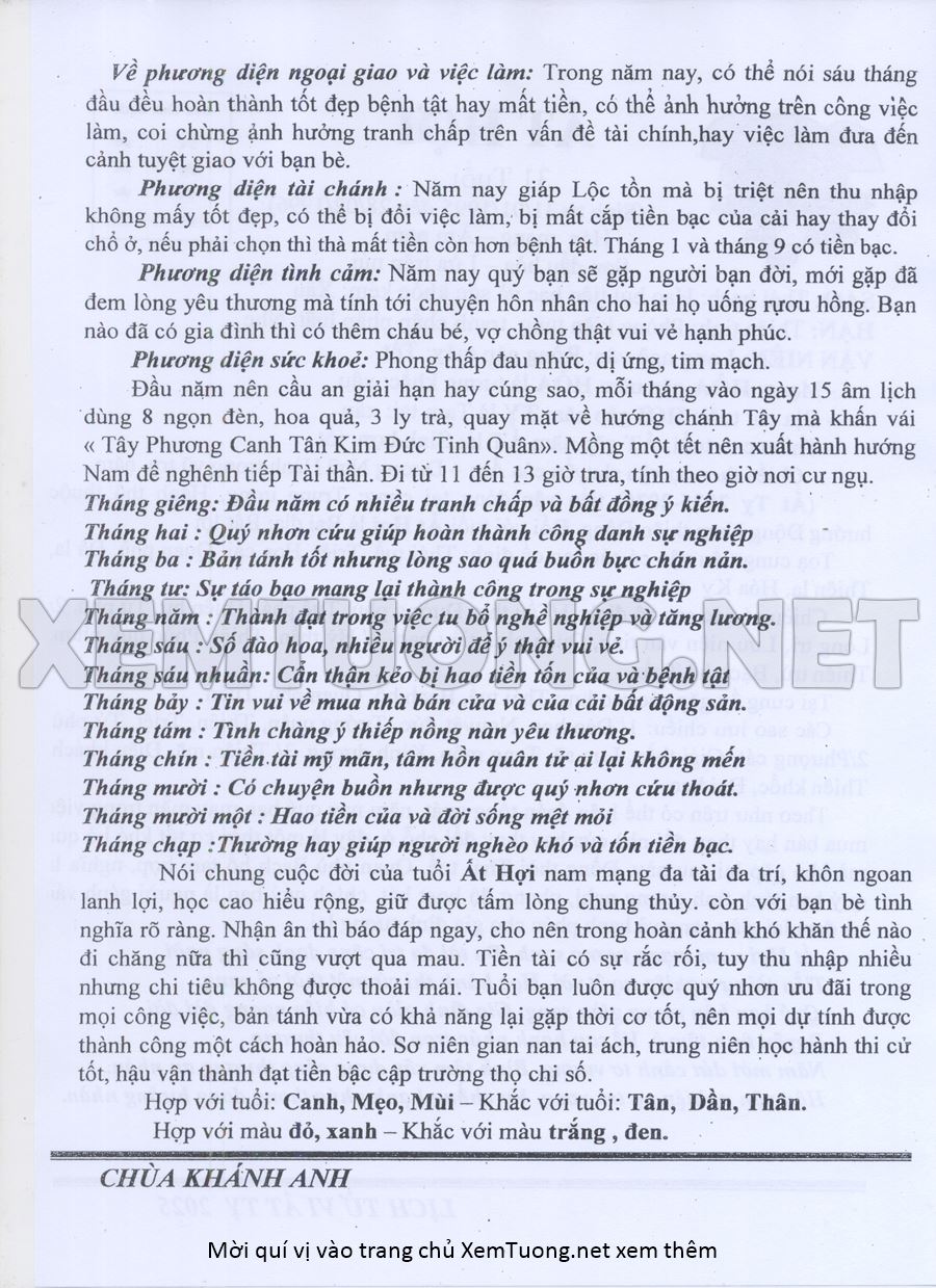 Có 3 phần xem tử vi năm Ất Tỵ 2025. Phần 1 là Thái Ất tử vi năm Ất Tỵ 2025 do Vương Dung Cơ (TQ) luận giải, Phần 2 do chùa Khánh Anh biên soạn, phần 3 là Tử Vi 12 tháng năm Ất Tỵ 2025. Qúy vị có thể chọn xem tất cả 3 phần rồi tổng hợp lại, những câu thường lập lại nhiều có khả năng sảy ra hơn.