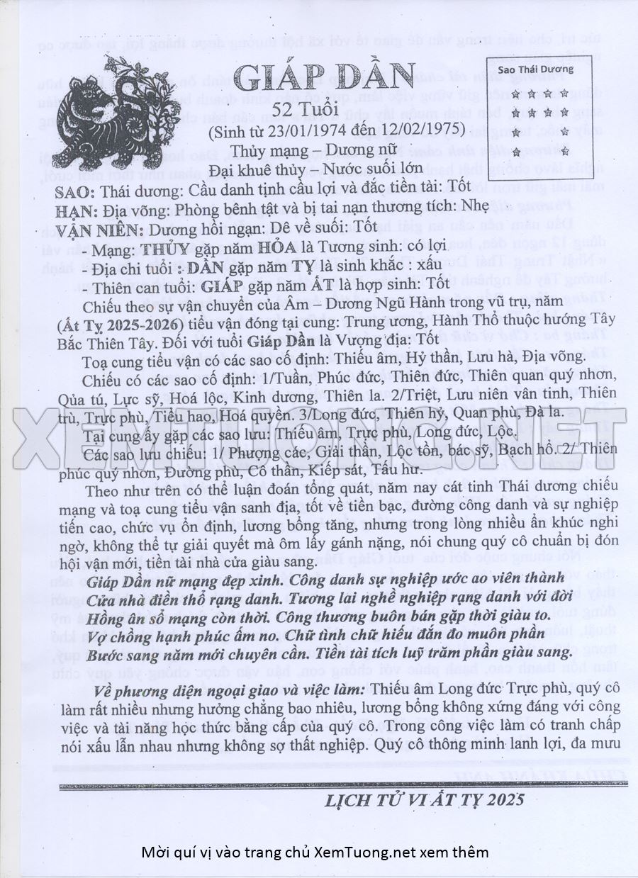 Tử Vi Năm Ất Tỵ 2025 mạng nữ GIÁP DẦN
