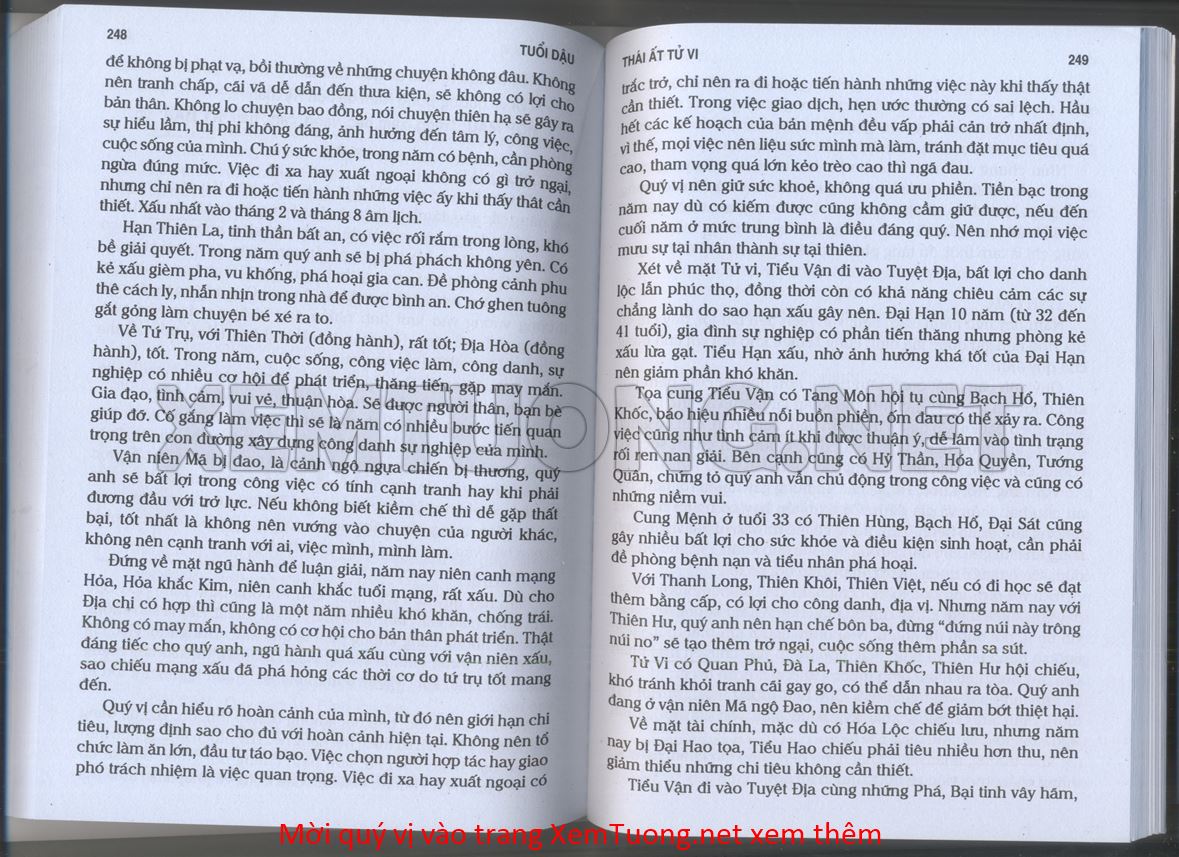 (Lưu ý: Thái Ất Tử Vi được chúng tôi scan từ sách, do đó mỗi tuổi sẽ có nhiều trang, quý vị xem xong hãy nhấn vào trang tiếp theo để xem hết phần tuổi muốn xem. Nếu quý vị xem bằng điện thoại thì hãy kéo qua lại để xem phần bị khuất.)