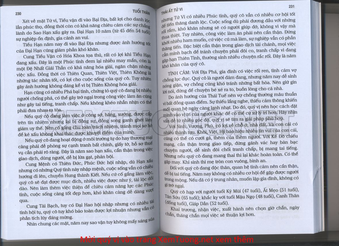 (Lưu ý: Thái Ất Tử Vi được chúng tôi scan từ sách, do đó mỗi tuổi sẽ có nhiều trang, quý vị xem xong hãy nhấn vào trang tiếp theo để xem hết phần tuổi muốn xem. Nếu quý vị xem bằng điện thoại thì hãy kéo qua lại để xem phần bị khuất.)