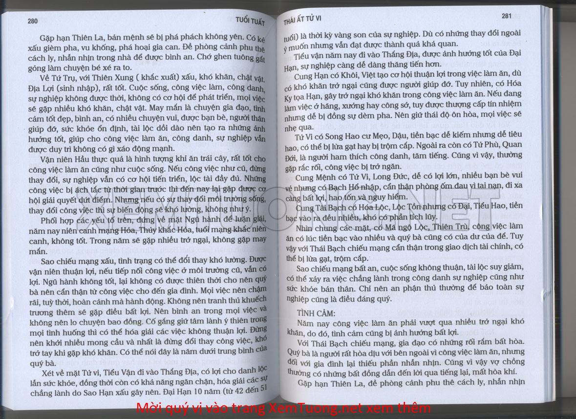 (Lưu ý: Thái Ất Tử Vi được chúng tôi scan từ sách, do đó mỗi tuổi sẽ có nhiều trang, quý vị xem xong hãy nhấn vào trang tiếp theo để xem hết phần tuổi muốn xem. Nếu quý vị xem bằng điện thoại thì hãy kéo qua lại để xem phần bị khuất.)