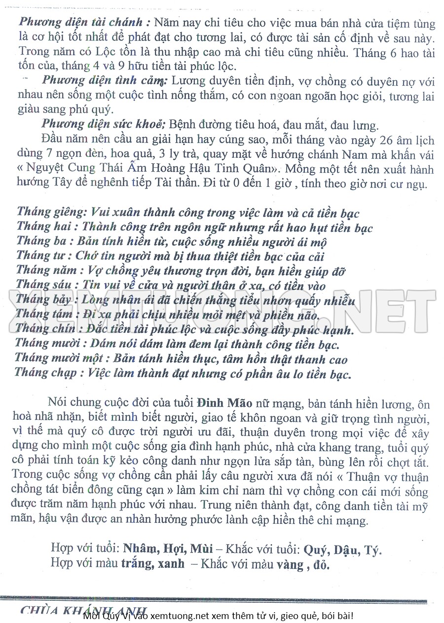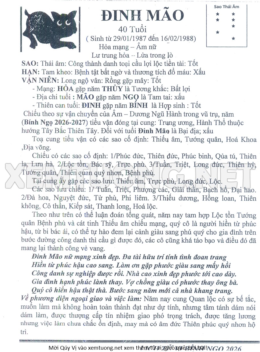 Tử Vi Năm Bính Ngọ 2026 mạng nữ Đinh MÃO