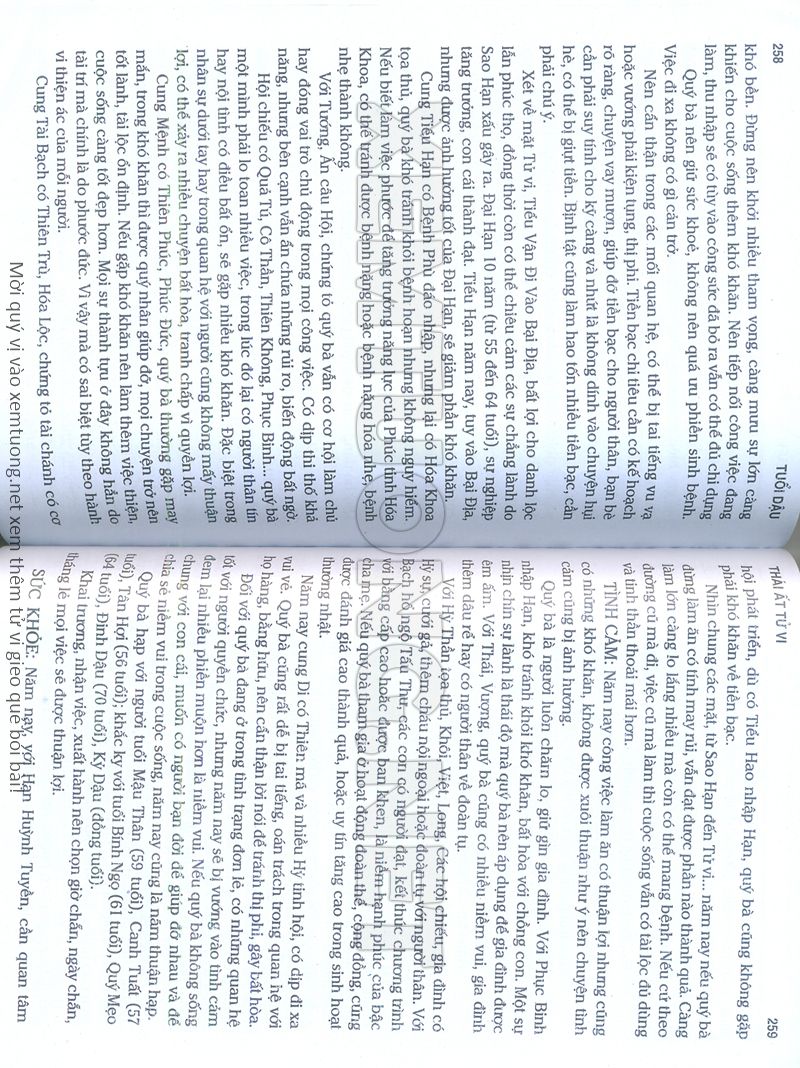 (Lưu ý: Thái Ất Tử Vi được chúng tôi scan từ sách, do đó mỗi tuổi sẽ có nhiều trang, quý vị xem xong hãy nhấn vào trang tiếp theo để xem hết phần tuổi muốn xem. Nếu quý vị xem bằng điện thoại thì hãy kéo qua lại để xem phần bị khuất.)